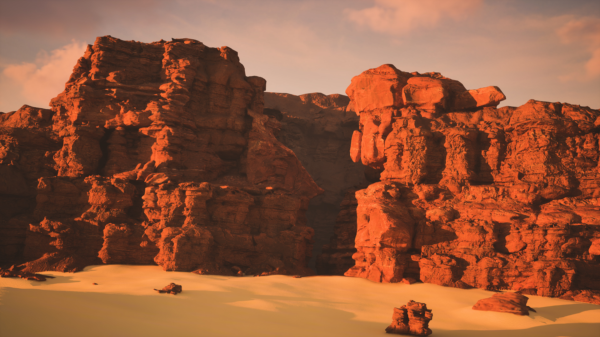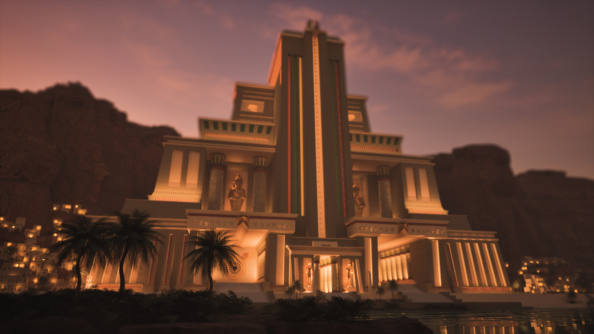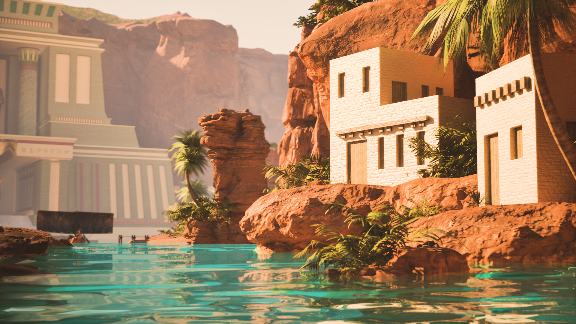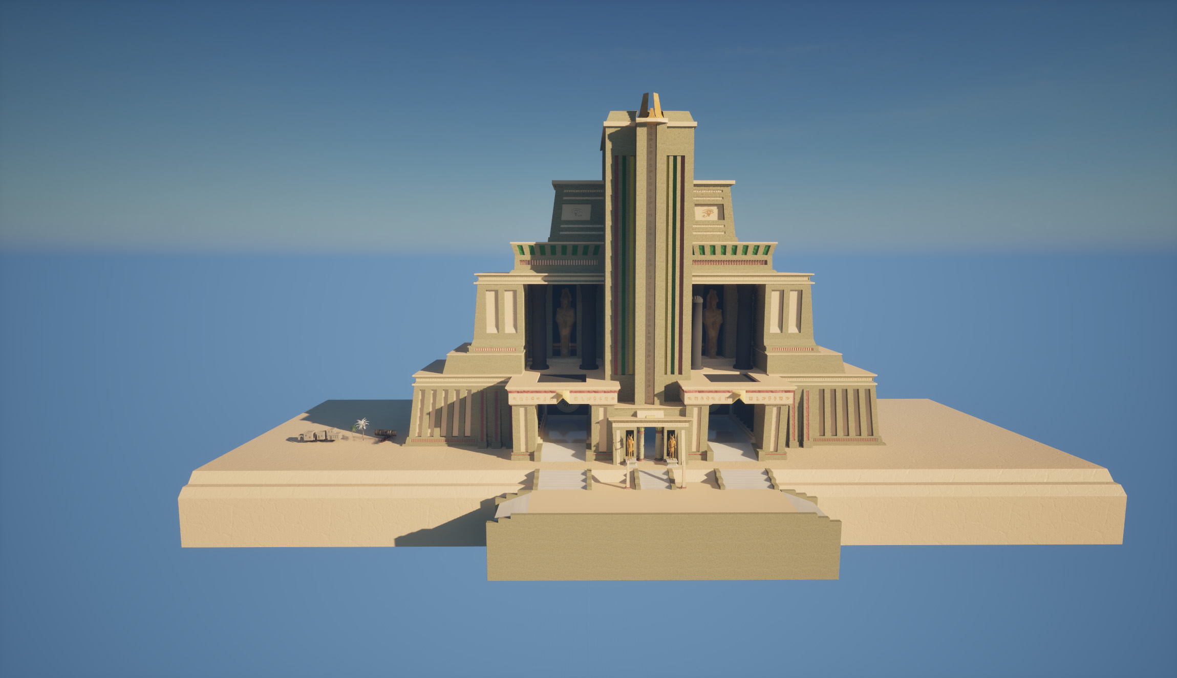 Amongst desert sand, rock formations and the lurking heat death a florishing oasis protects a ancient lost civilisation. The center piece and the heart is its temple which emerges on the horizon, granting lost wanderes refuge.